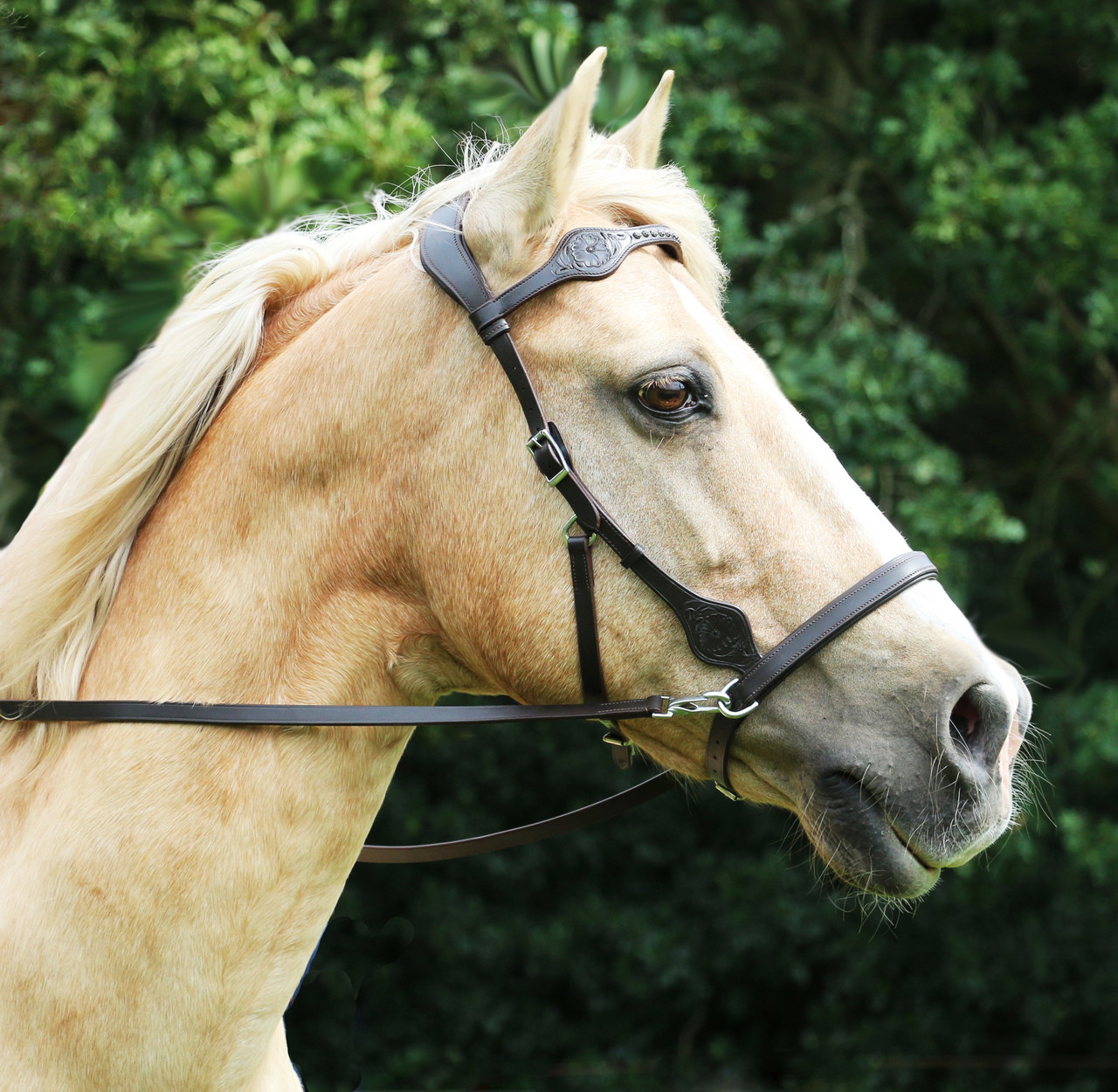 - Unique studded, ornately embossed & shaped browband & cheek piece
